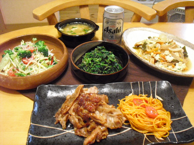 ショウガ焼き、ほうれん草の胡麻和え、パスタのちりめんサラダ、昆布とお豆腐の煮物・・・・・