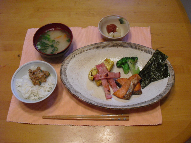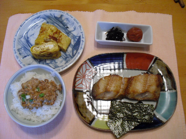 今日は、和食にしようっと・・・言いながら、私自慢の出し巻き卵、焼き魚、ネギ入り納豆、焼きノリ、、、